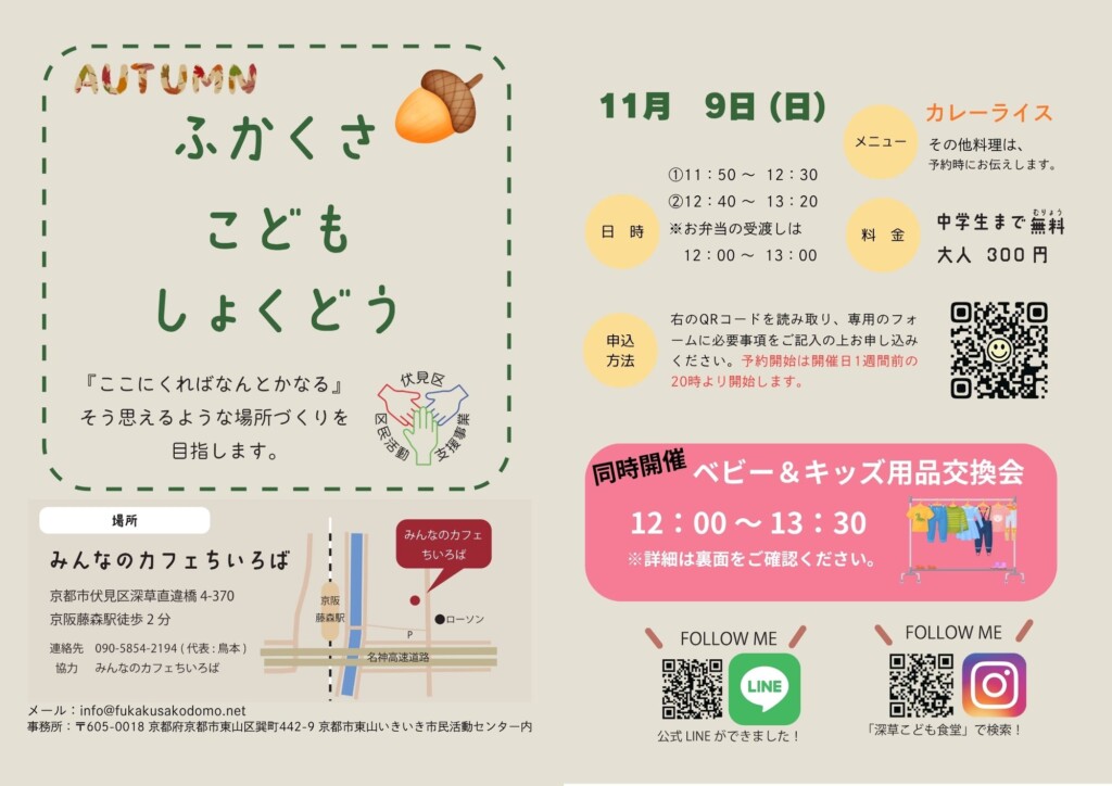 12:00 ~ 13:00 まで深草子ども食堂玄関にて開催します。